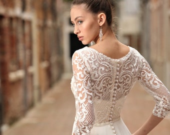 Emilie handmade wedding dress with cream ivory matte fine lace.